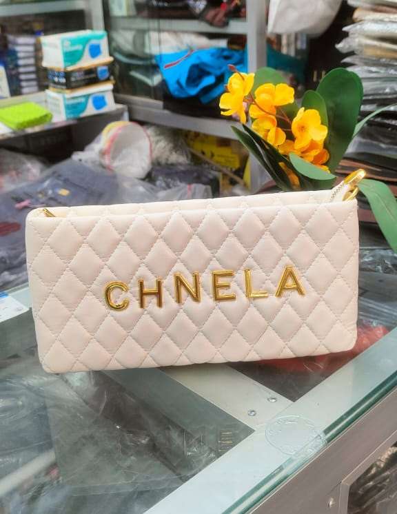 Organize your beauty essentials in style with this chic CHNELA Cosmetic Pouch. Featuring a soft cream diamond-quilted texture and bold gold lettering.