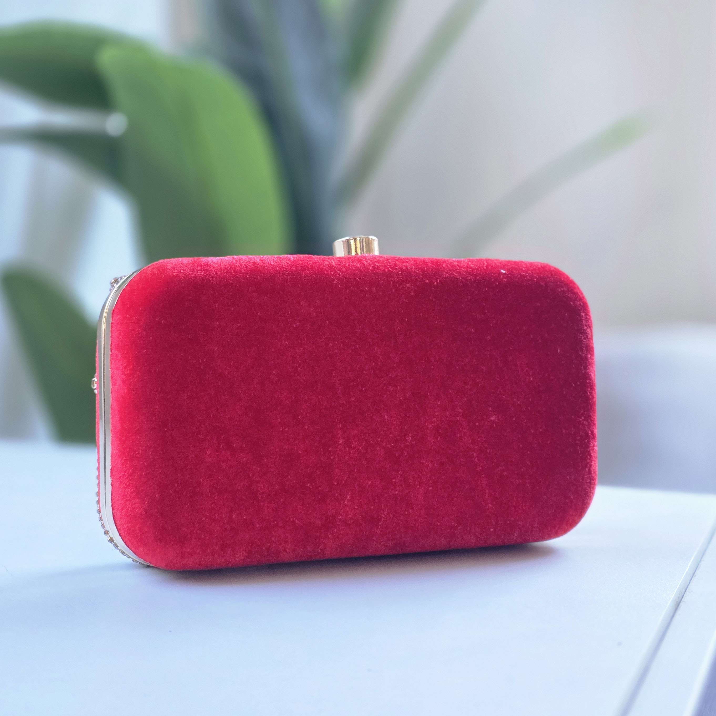 Make a bold statement with this exquisite Red Velvet Beaded Clutch. Features intricate gold embroidery on a rich red velvet body and a secure top clasp.