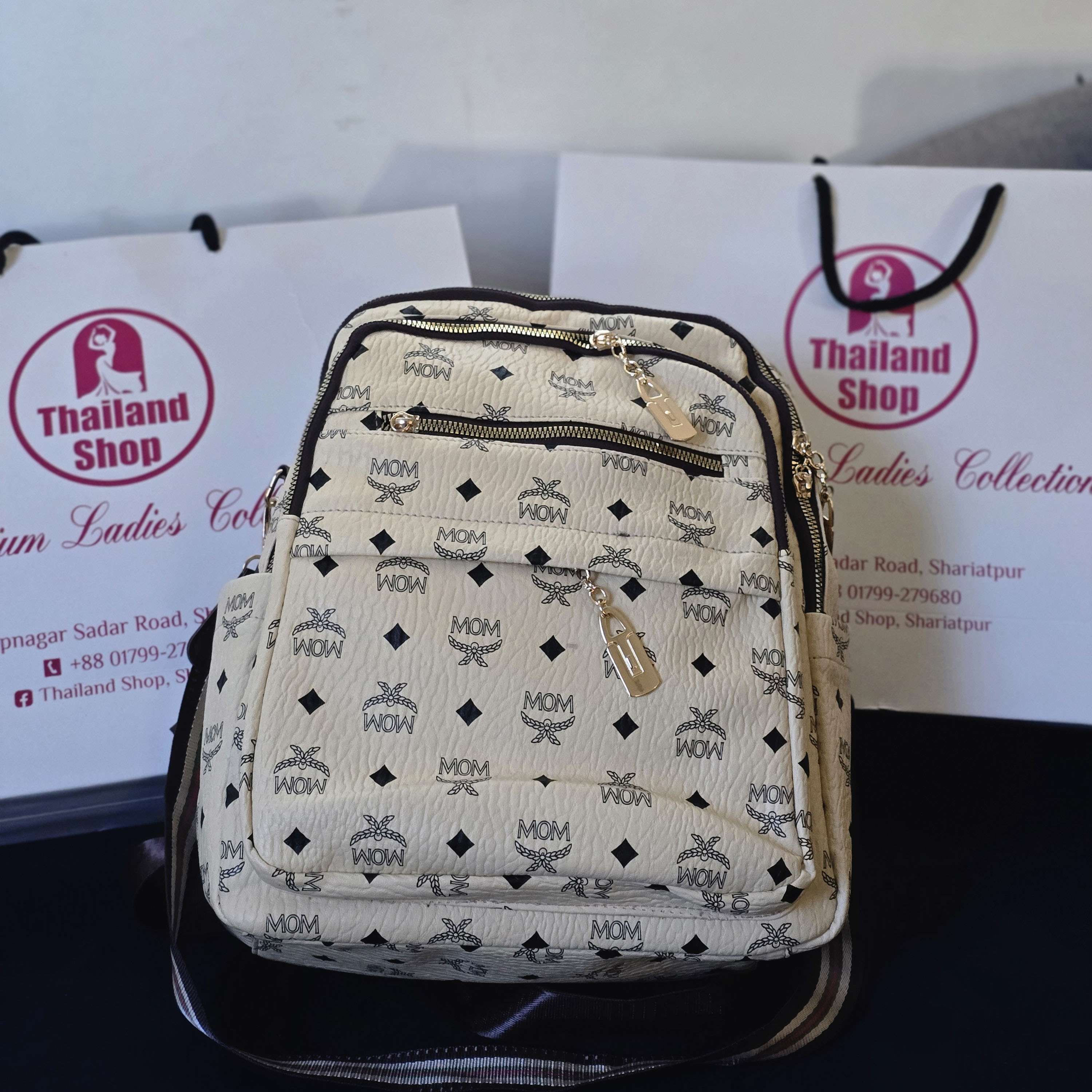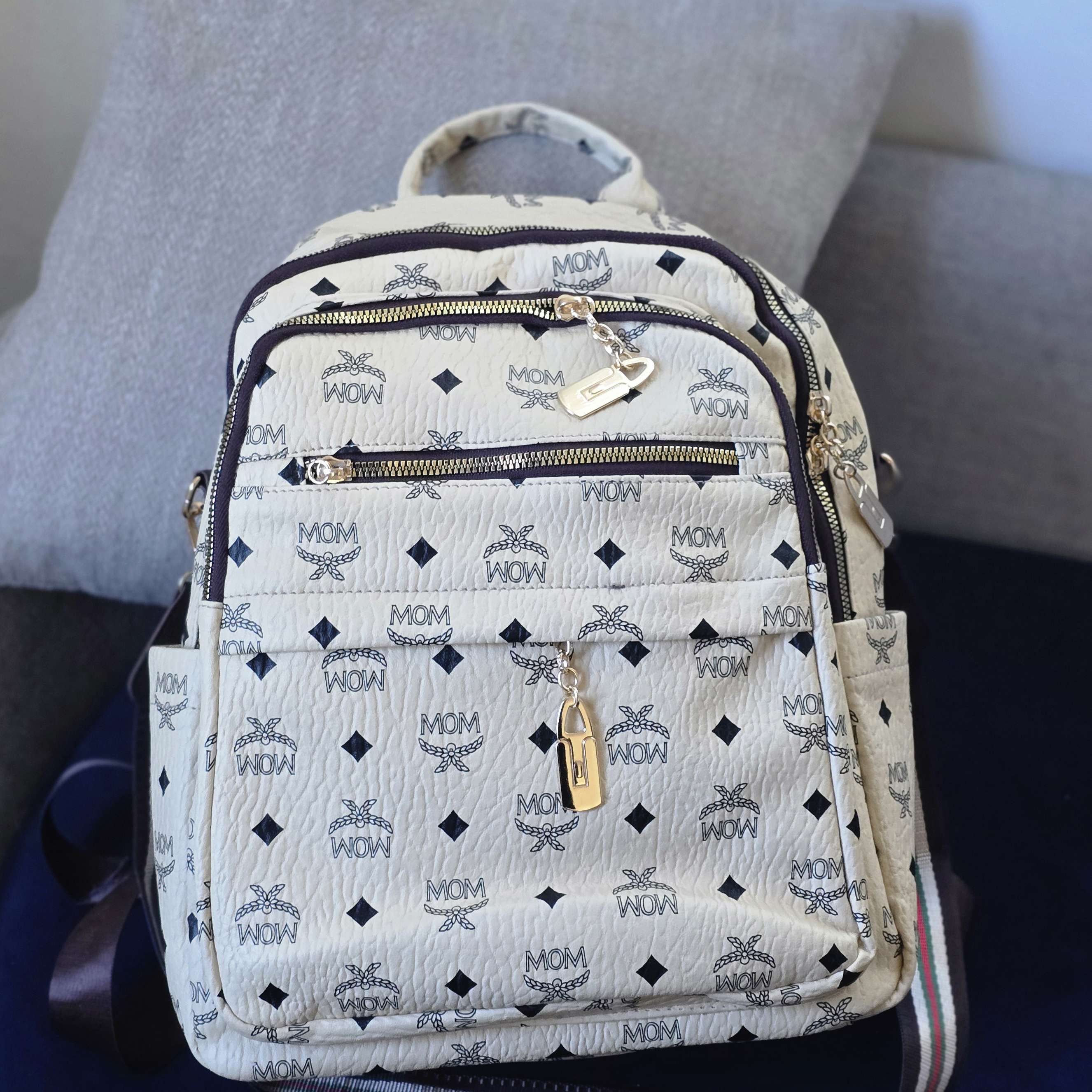 Step out in style with this Cream Monogram Backpack. Features a trendy "MOM" pattern, gold-tone lock charms,